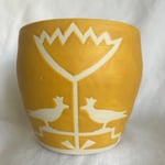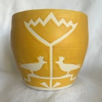 Recently, I’ve been making some pots that are less elaborately decorated in simple bright colors to bring that extra pop of color into your home. I took a lot of influence from Scandinavian design and focused more on simplicity and symmetry. Wheel thrown with recycled clay, hand cut stencils designed by me. This one has a hole at the bottom, great for succulents! Porcelain clay. Approximately, 4.5 inches tall, widest diameter 4 inches. Each pot is unique, one of a kind. My potter’s mark is on the bottom.
