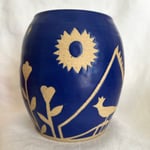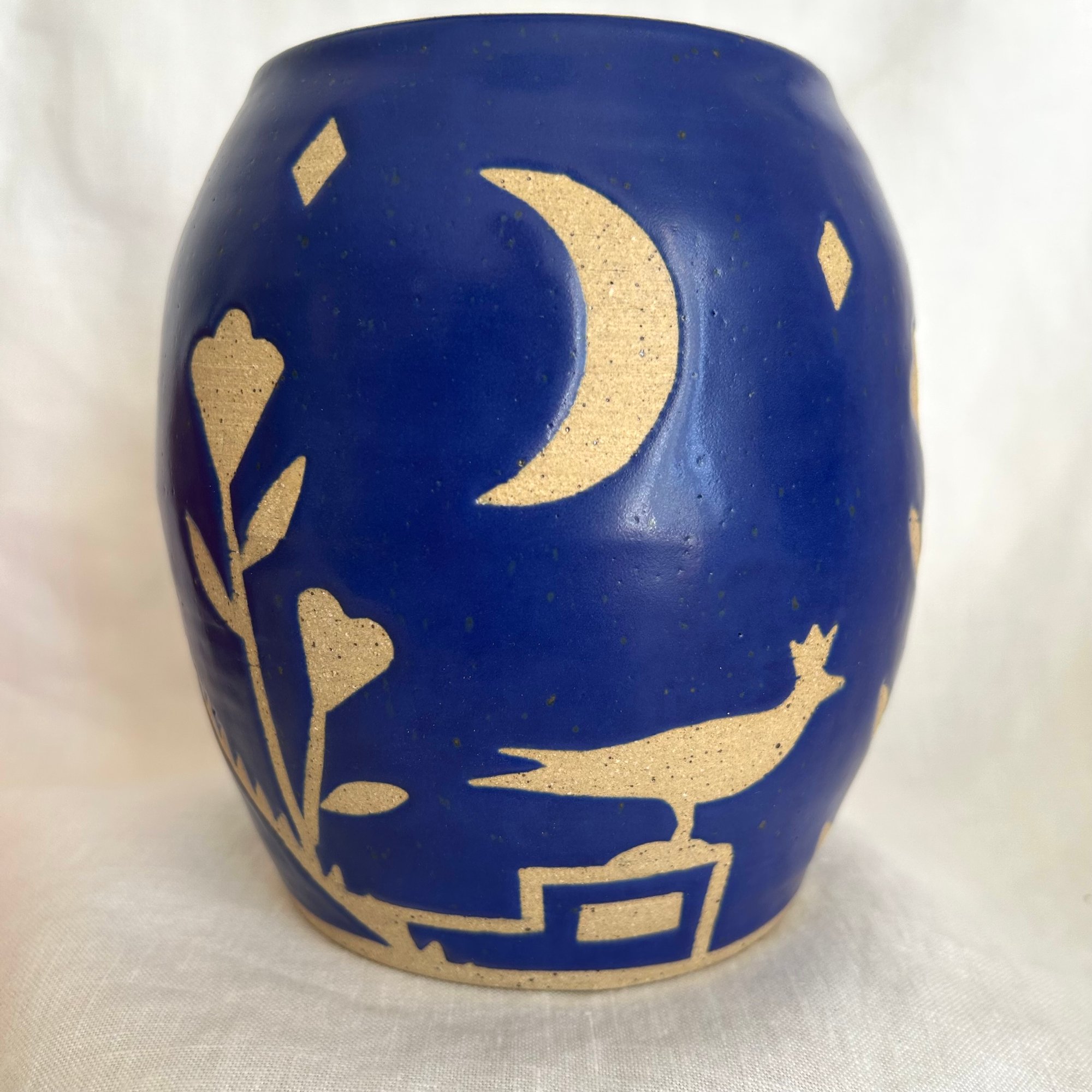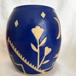 Wheel thrown with recycled clay, hand cut stencils designed by me. Food safe. Approximately 5 inches tall, 3 inch diameter at the top. My potter’s mark is on the bottom.