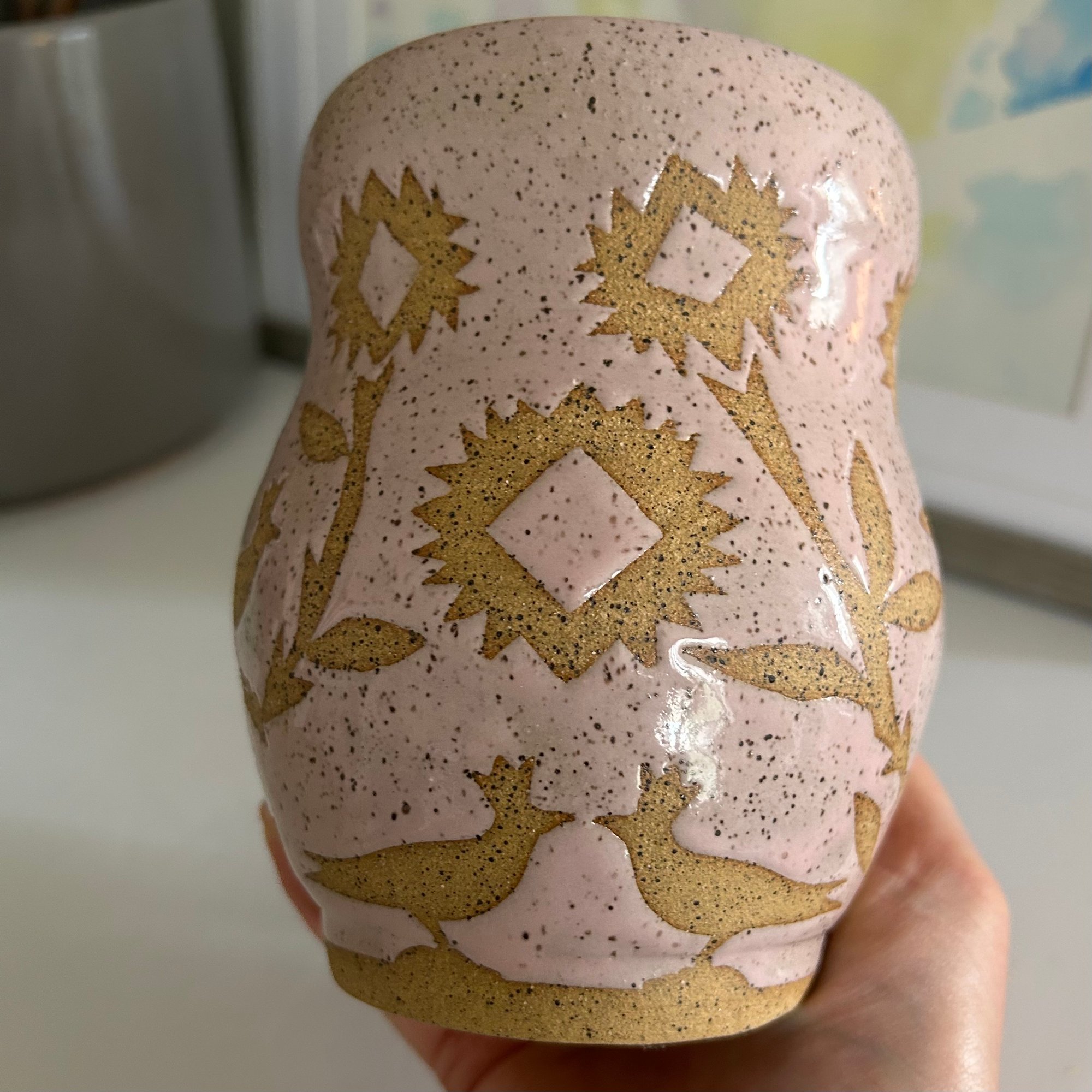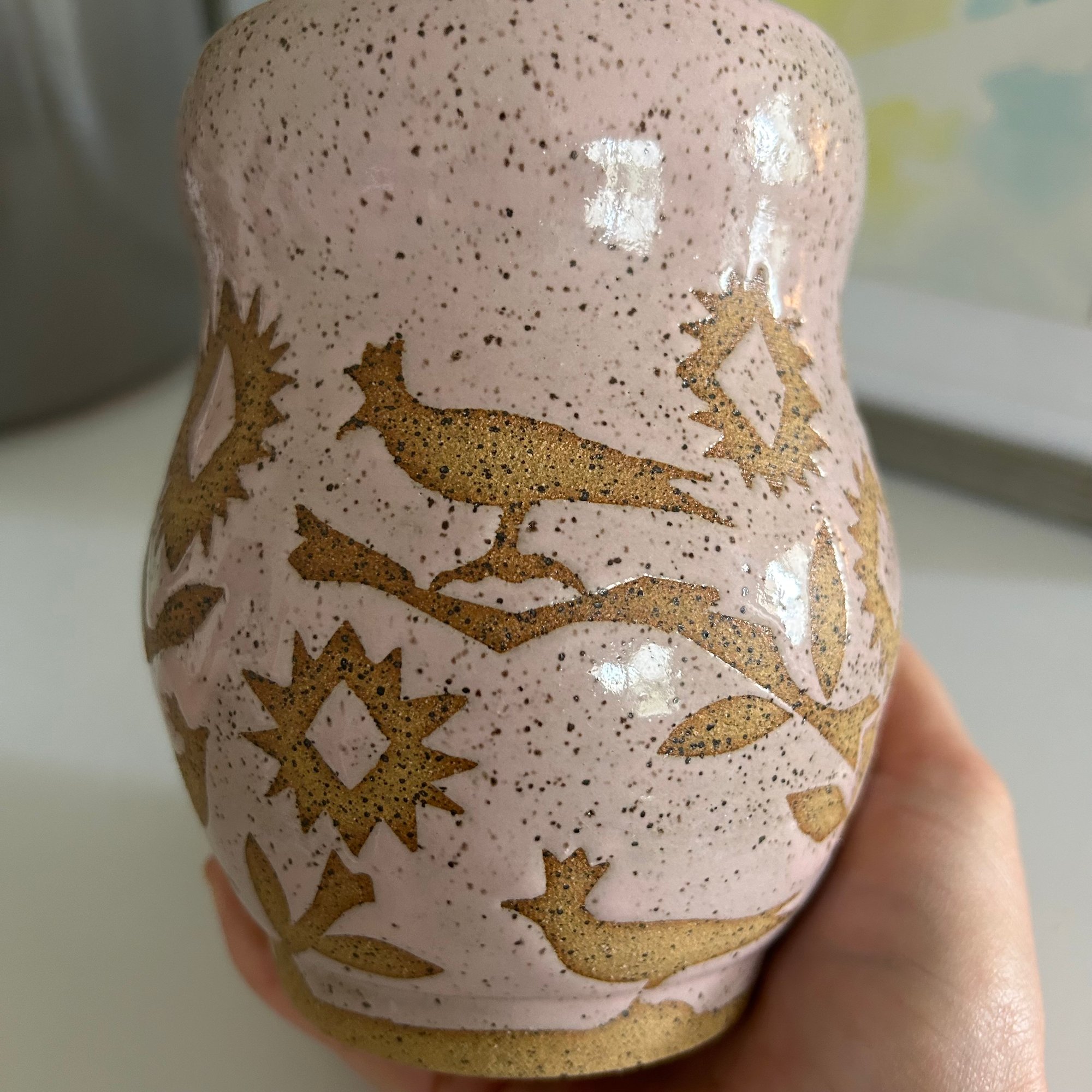 This is such a sweet little vase. You can play “find the birdies” hidden within the flowers. My inspiration was a very noisy bird-filled bush in Hawaii. Perfect for a few short handpicked blooms at your desk or as a utility vase. Soft custom-blended pink glaze on speckled stoneware, approximately 5.5 inches tall.