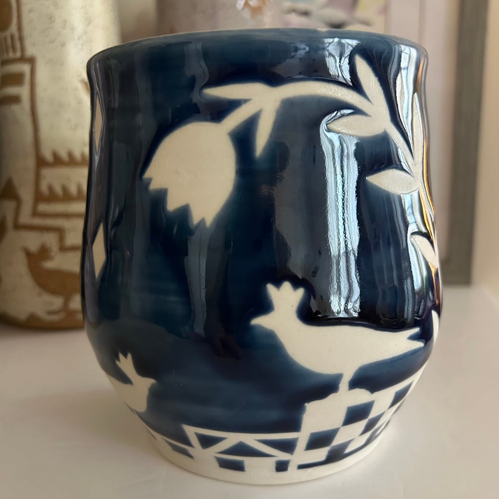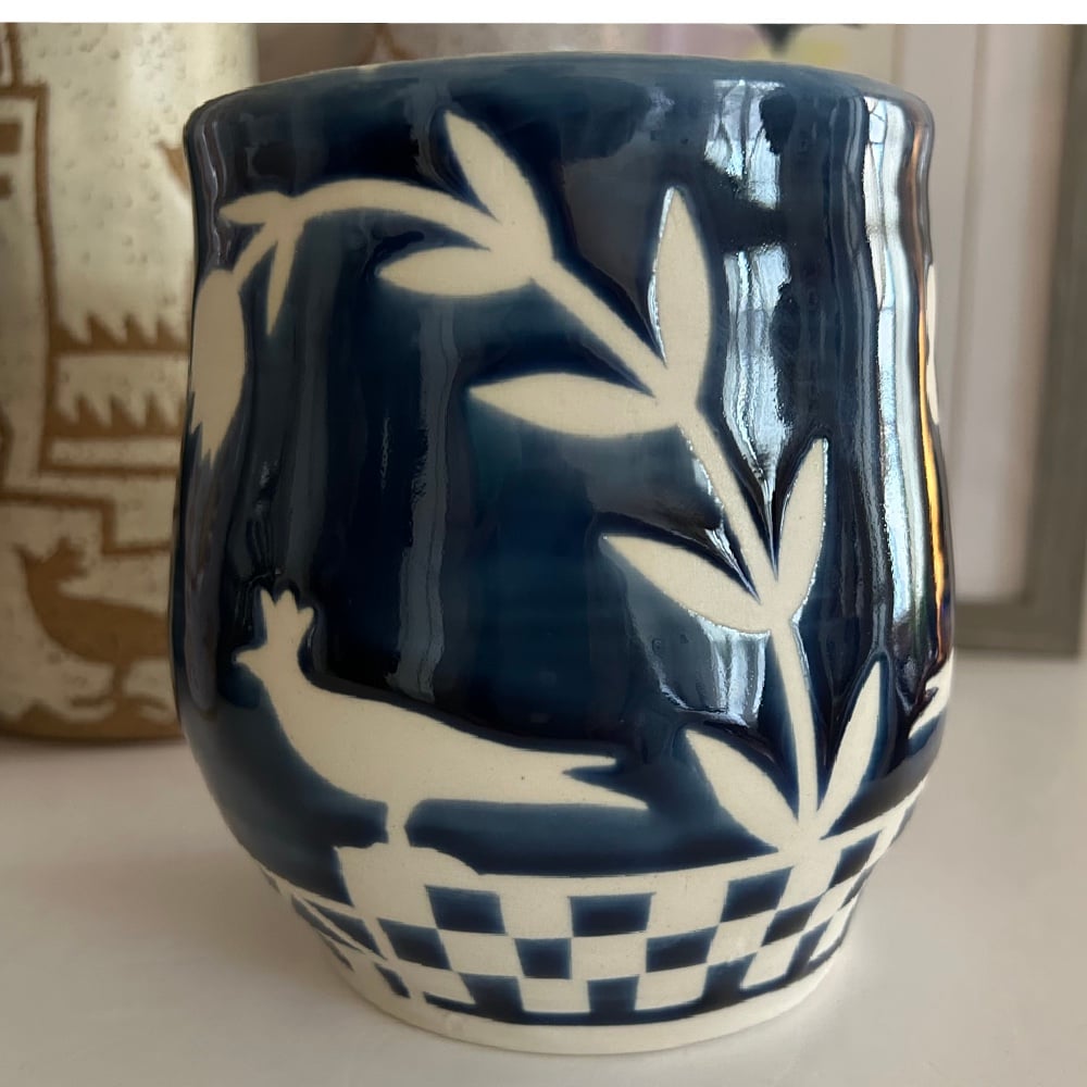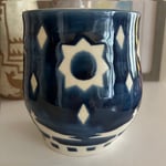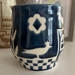 My first porcelain pot. I’ve resisted porcelain since I think of it as so delicate and my style is so wonky, but I like how this little wonky pot turned out with dark blue glaze. Stands a little over 5 inches tall, with a mouth approximately 4 inches in diameter.