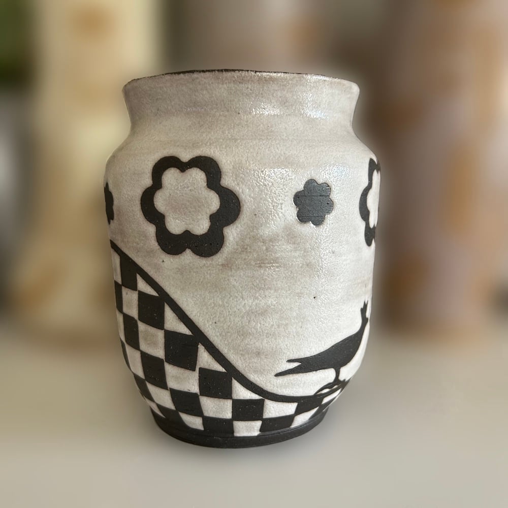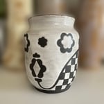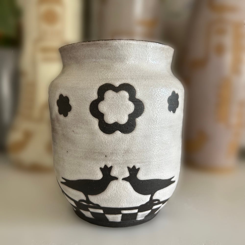 Sweet little utility vase in black clay. Interior is glazed raspberry pink. I’ve marked the price down because this little guy is a bit on the heavy side. The advantage to a heavier piece is that it’s very sturdy, and your cat is less likely to knock it over. Would be great as a decorative piece, or a pen/pencil holder on your desk. It’s just a really sweet little bb. 5 inches tall. My potter’s mark is on the bottom.